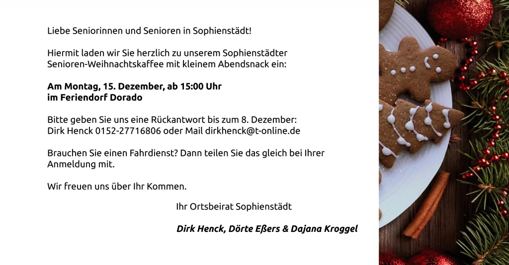 Alle Sophienstädter Senioren sind zum traditionellen Senioren-Weihnachtskaffee eingeladen. NUR MIT ANMELDUNG BIS ZUM 8.12.2025.