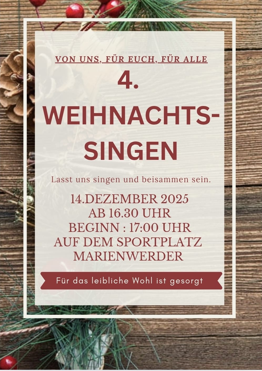 Zum 4. Mal treffen wir uns zum nun schon lieb gewordenen Weihnachtssingen. Deshalb organisieren der Sportverein „SV Freya Marienwerder“ und der Förderverein „Kita Mäusestübchen“ auch in diesem Jahr wieder ein Weihnachtssingen. Der Sportplatz wird in weihnachtliches Licht getaucht, für Essen und Trinken ist gesorgt. Alle die Lust haben, in gemütlicher Atmosphäre ein paar Weihnachtslieder anzustimmen,...