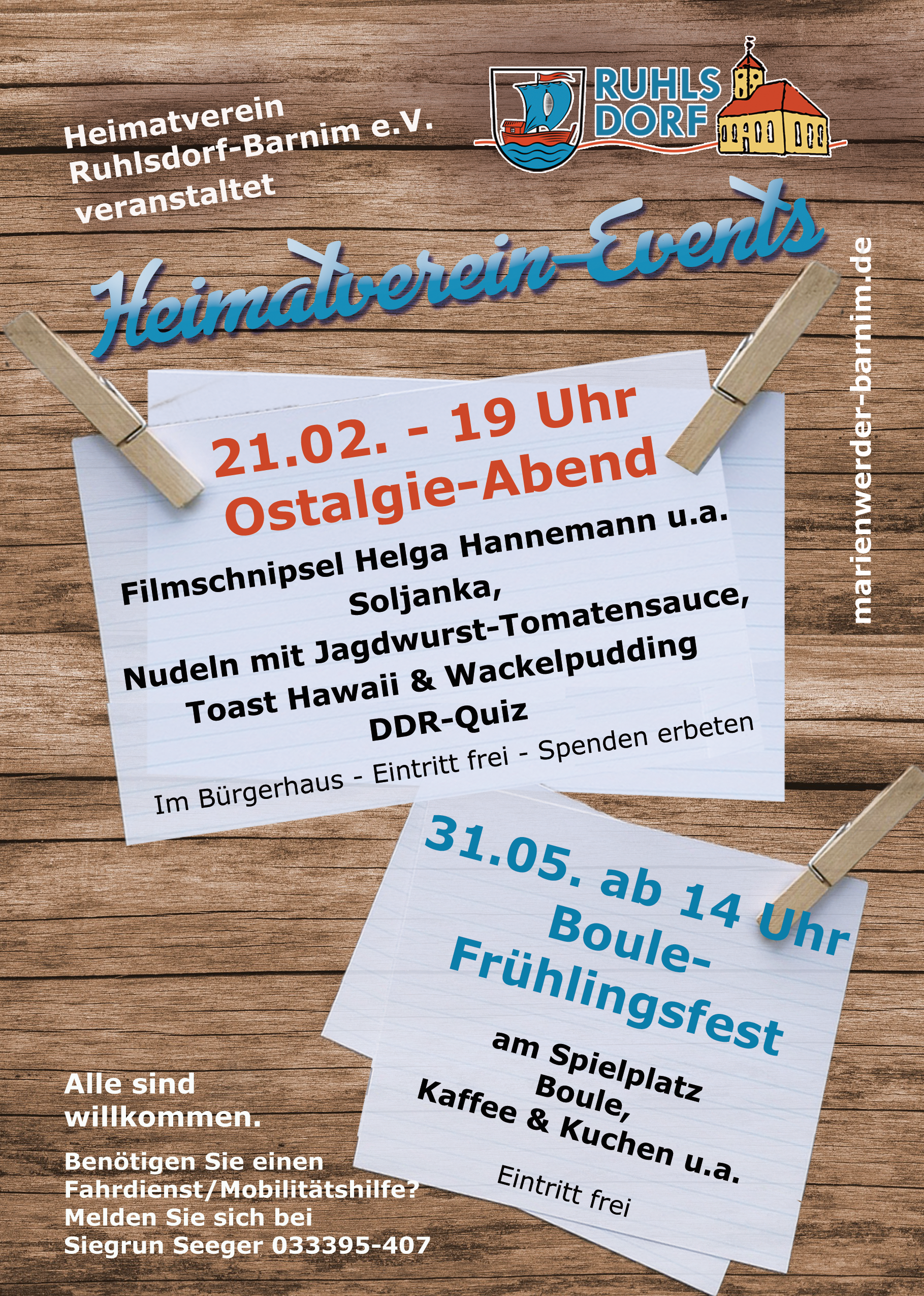 Marienwerder war früher ein Schifferdorf und die meisten Familien lebten von der Schifffahrt. Viele junge bzw. neue Bürgerinnen und Bürger sind an der Geschichte der Schiffer interessiert, jedoch kaum jemand kennt sie. Deshalb erzählt einer der letzten Schiffer aus Marienwerder über sein Berufsleben.Der Eintritt ist frei.