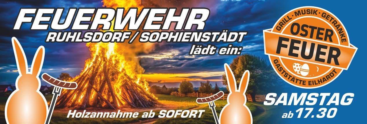 Das große traditionelle Osterfeuer in Ruhlsdorf - bei Imbiss, Musik und Getränken im Garten der Gaststätte Eilhardt. Veranstaltet vom Förderverein der Freiwilligen Feuerwehr Ruhlsdorf-Sophienstädt e.V. |