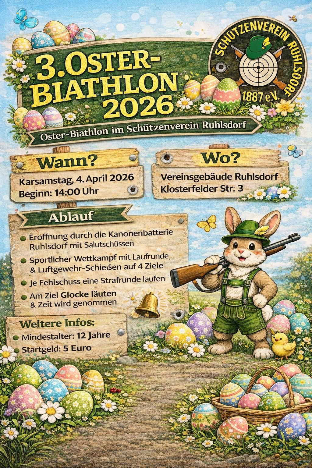 Der Schützenverein Ruhlsdorf lädt zu seinem 3. Osterbiathlon herzliche ein. Bei sportlichen Wettkämpfen kann man seine Treffsicherheit und Ausdauer testen. Viel Spaß allen Teilnehmern.